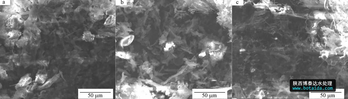 圖 5 污泥經不同處理后的SEM圖 (a.原污泥;b.蛋白酶;c. SC+蛋白酶)